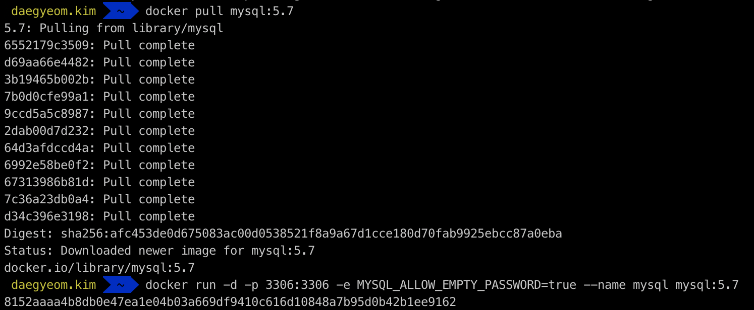 $ docker run -d -p 3306:3306 -e MYSQL_ALLOW_EMPTY_PASSWORD=true --name mysql mysql:5.7