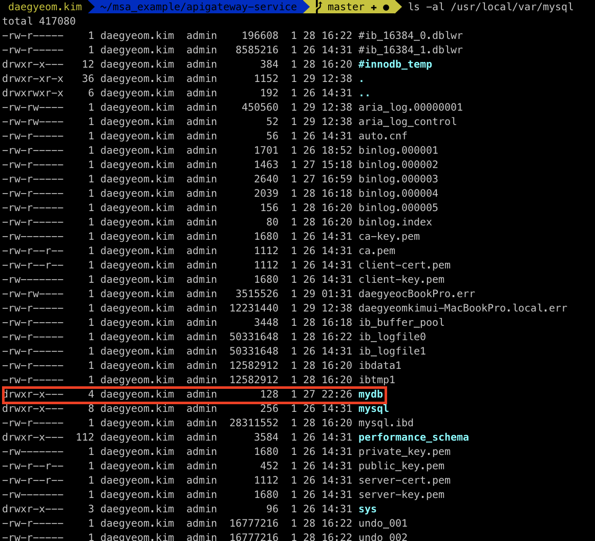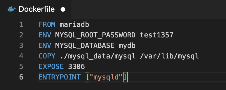 위 Dockerfile이 정상적으로 동작하려면 우선 /usr/local/var/mysql 디렉토리에서 db파일을 ./mysql 디렉토리에 백업해놓아야한다.