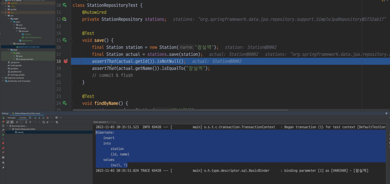 -> JPQL이 동작할때는 무조건 flush 가 발생하는데, 이유는 영속성이 없으므로 flush를 발생하지 않으면 '몽촌토성역'을 찾을수가 없는상황이기 때문이다. (위 코드 참고)