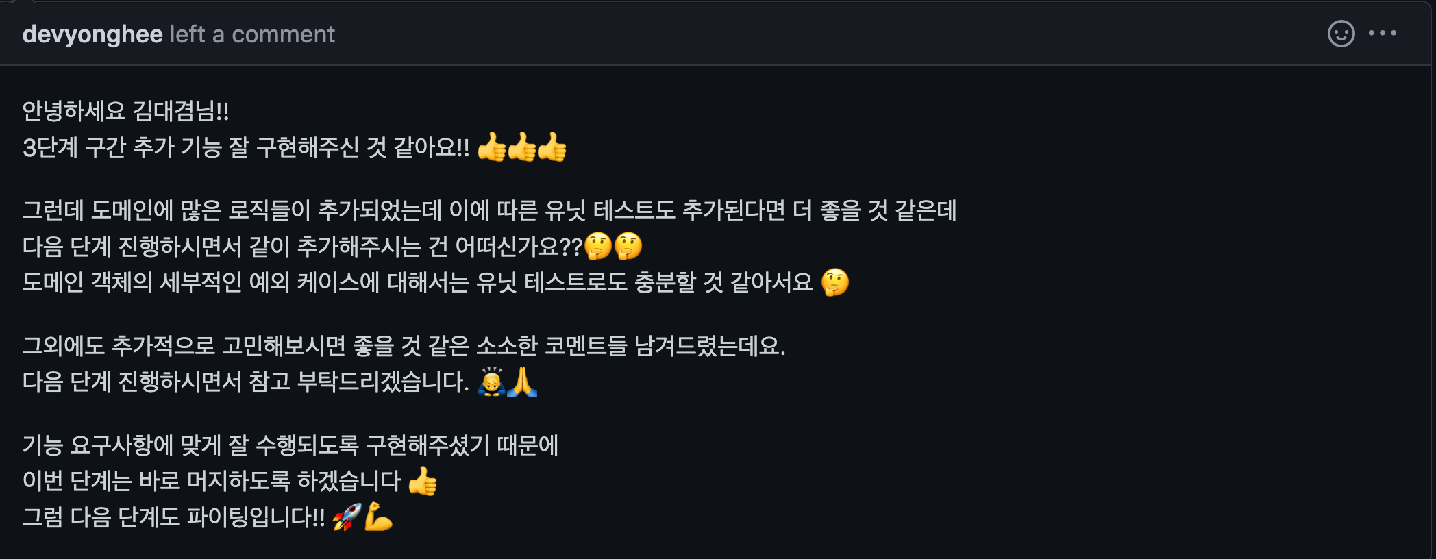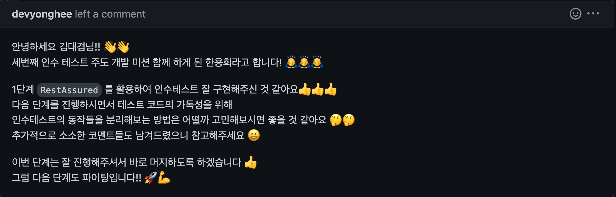 - 리뷰어님께서 인수테스트의 동작들을 분리해보는 것을 제안해주셨고 샘플 예제까지 링크를 공유해주셨다.