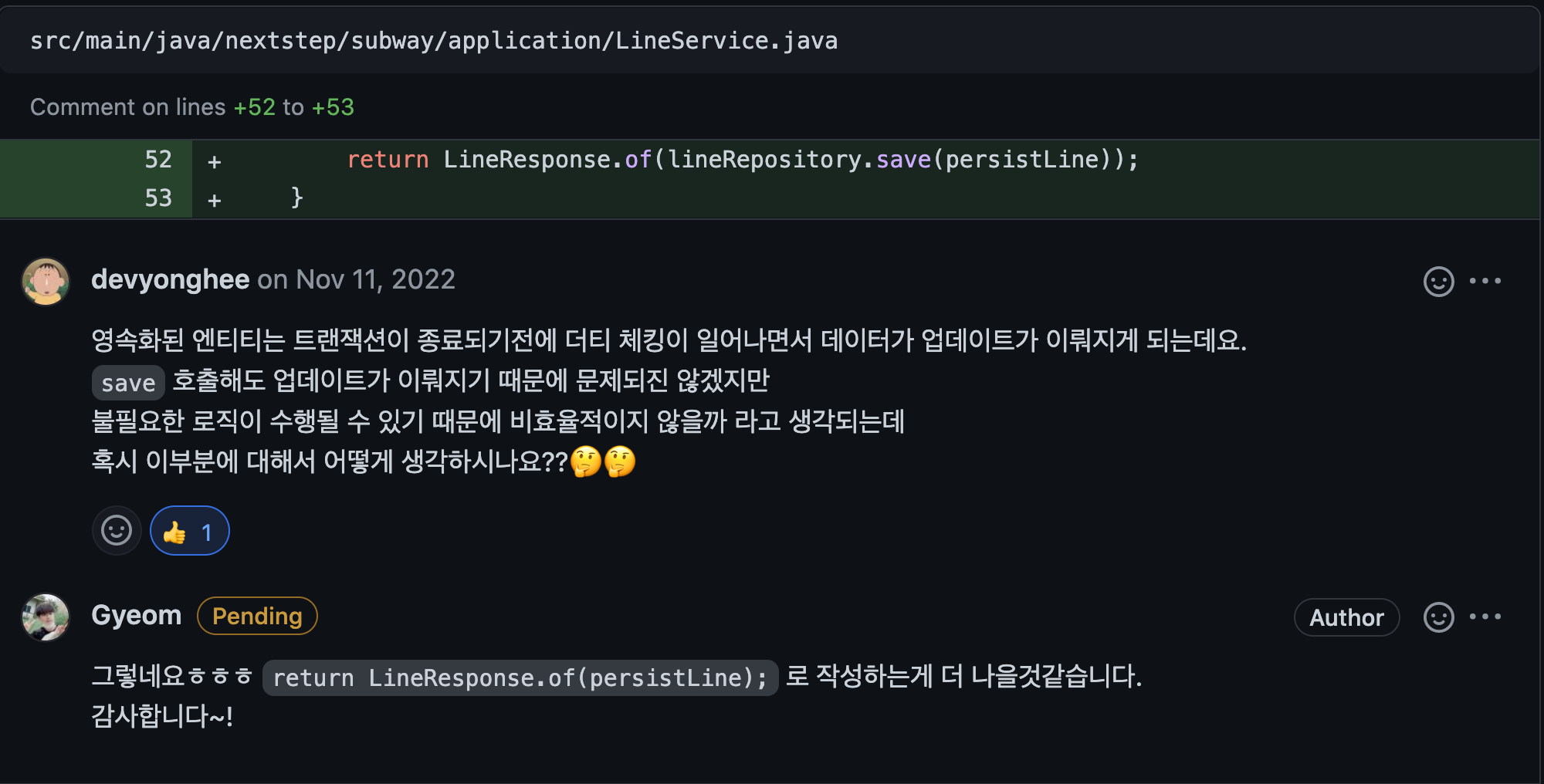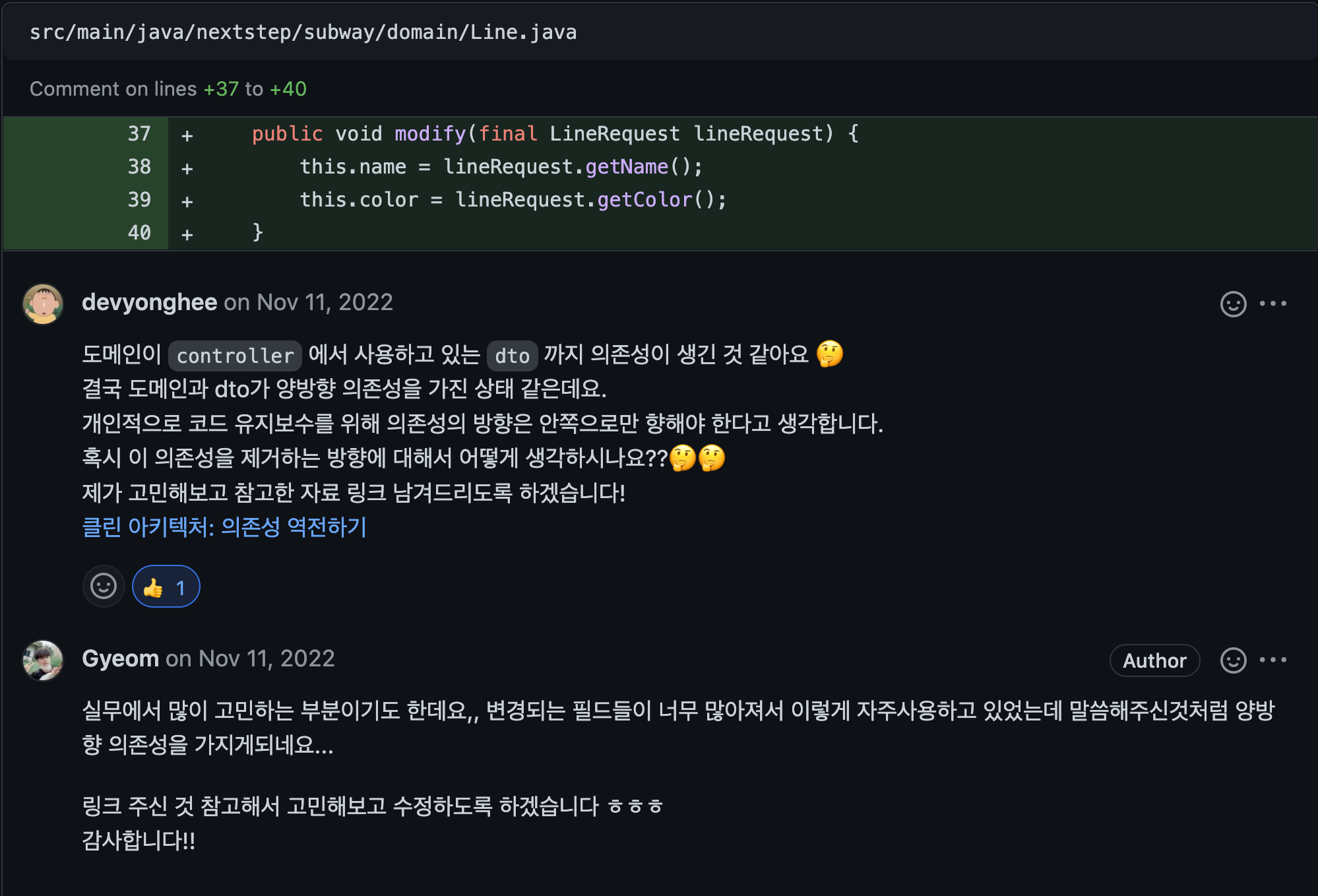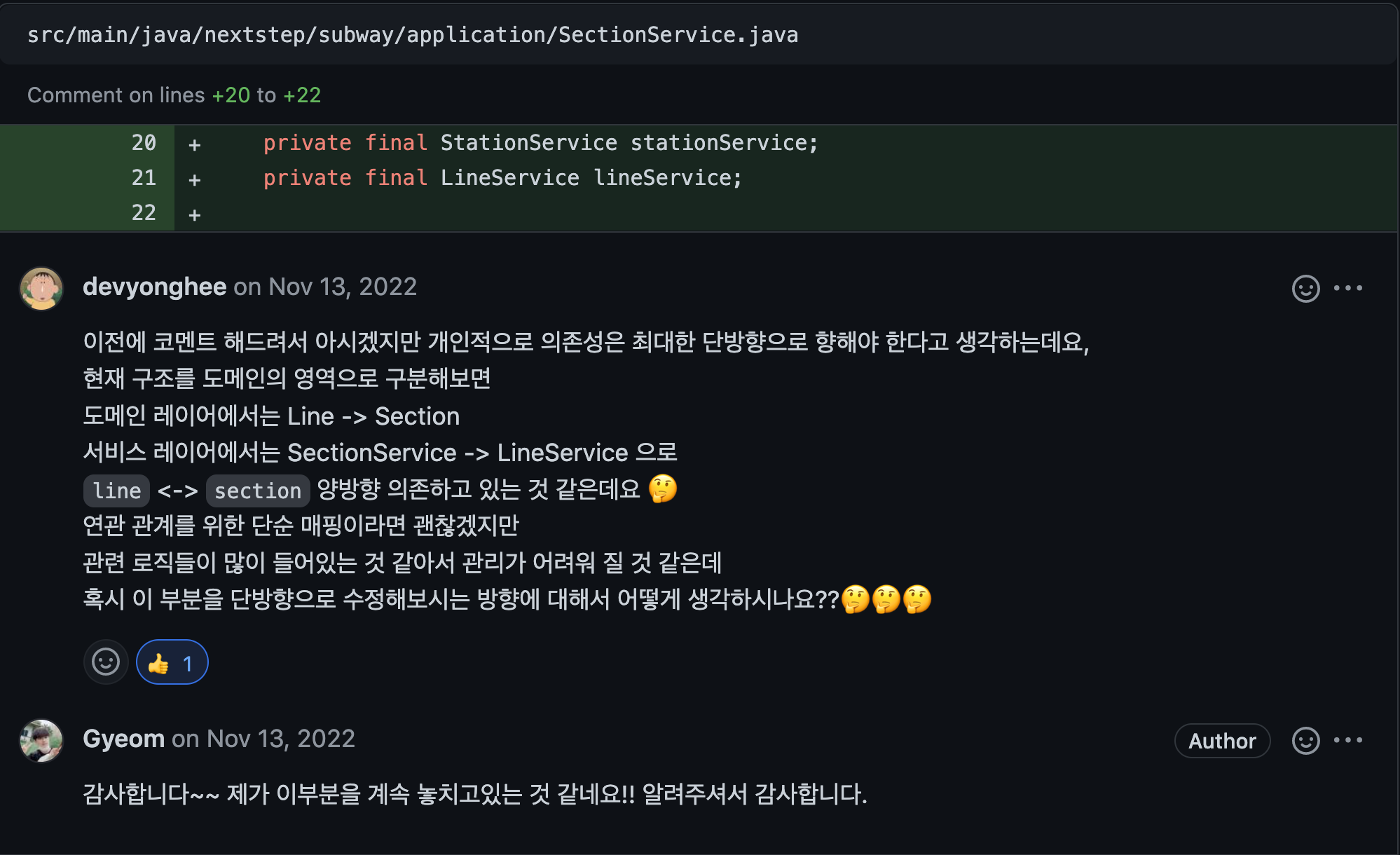 - 의존성이 양방향이라면 결국 하나의 서비스라는 것을 의미하기도 한다. 하지만, Line과 Section은 같은 서비스가 아니기 때문에 단방향을 향하도록 변경이 필요하다. 처음에는 의존성 개념에 대해 이해하기 어려웠지만, 미션을 수행하면서 리뷰어님이 지속적으로 피드백을 제공해주고 코드를 작성하면서 비슷한 상황을 반복해서 접하다보니 자연스럽게 이해할 수 있었다.