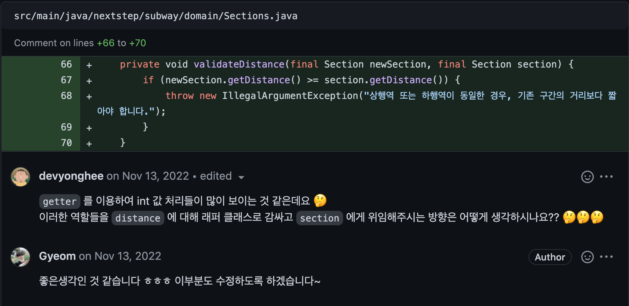 - 의존성이 양방향이라면 결국 하나의 서비스라는 것을 의미하기도 한다. 하지만, Line과 Section은 같은 서비스가 아니기 때문에 단방향을 향하도록 변경이 필요하다. 처음에는 의존성 개념에 대해 이해하기 어려웠지만, 미션을 수행하면서 리뷰어님이 지속적으로 피드백을 제공해주고 코드를 작성하면서 비슷한 상황을 반복해서 접하다보니 자연스럽게 이해할 수 있었다.