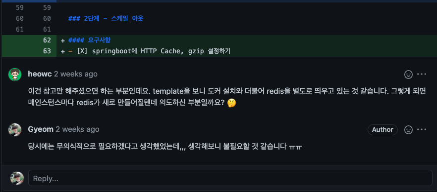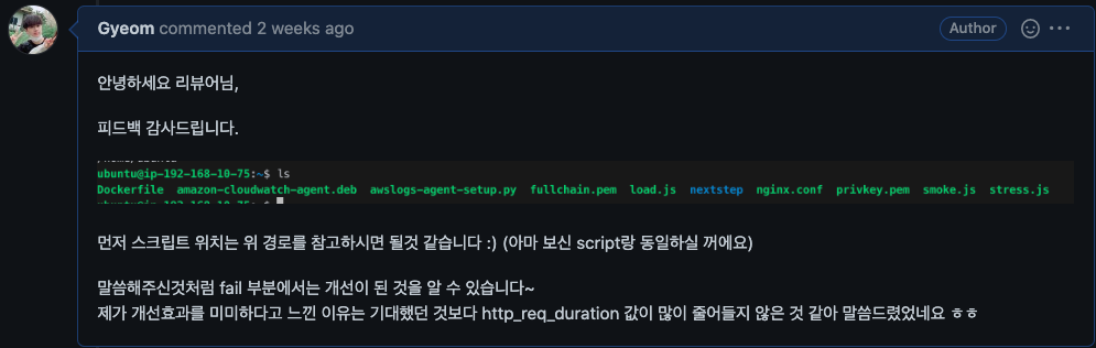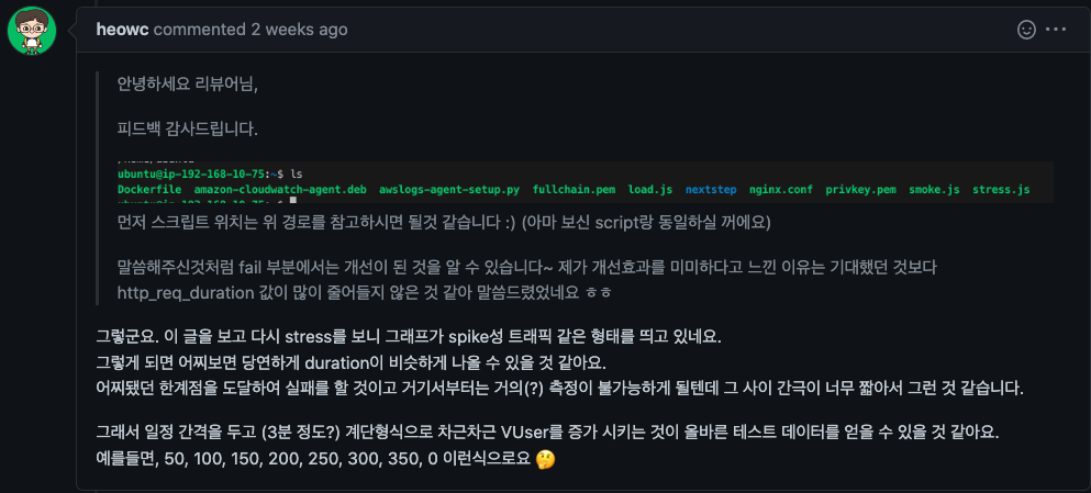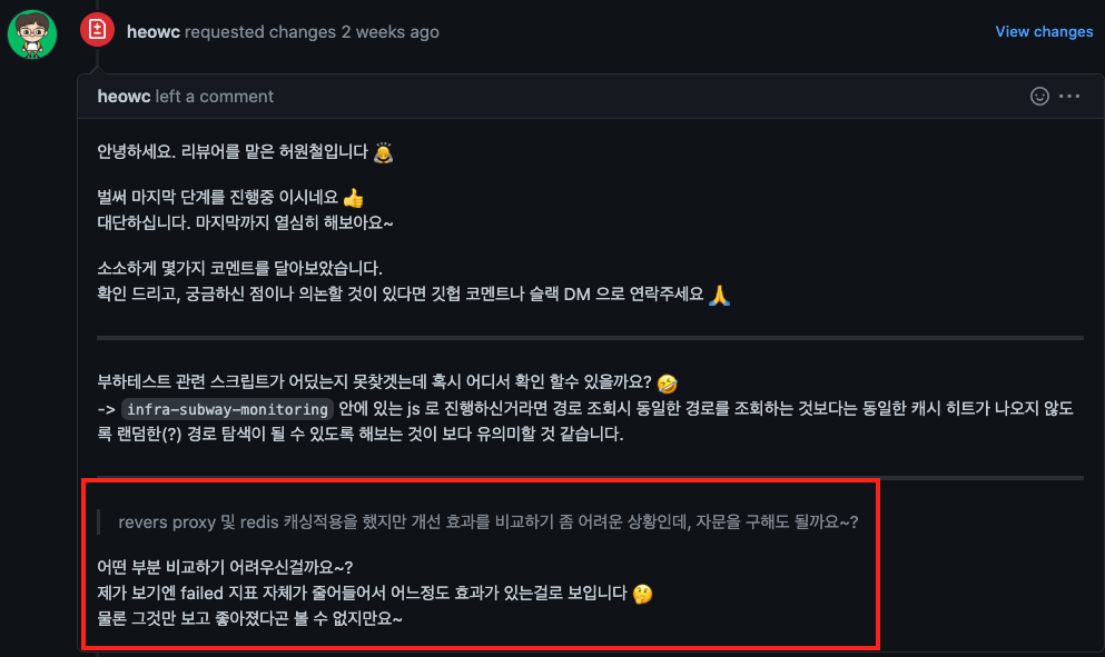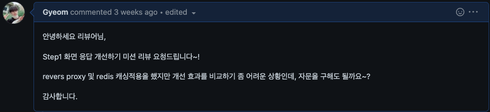 안녕하세요 리뷰어님, Step1 화면 응답 개선하기 미션 리뷰 요청드립니다~! revers proxy 및 redis 캐싱적용을 했지만 개선 효과를 비교하기 좀 어려운 상황인데, 자문을 구해도 될까요~? 감사합니다.