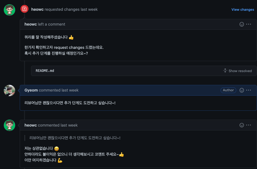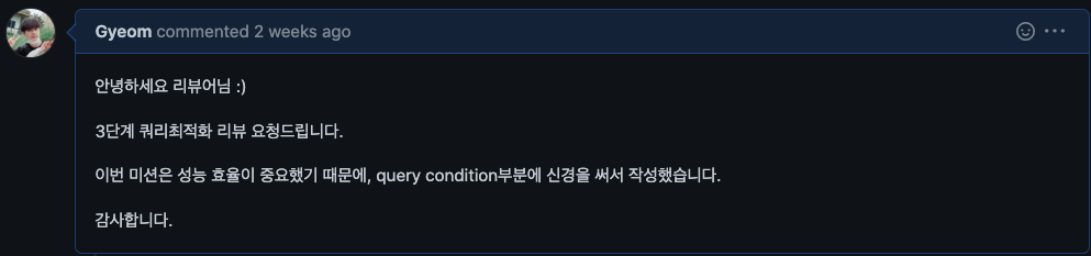 안녕하세요 리뷰어님 :) 3단계 쿼리최적화 리뷰 요청드립니다. 이번 미션은 성능 효율이 중요했기 때문에, query condition부분에 신경을 써서 작성했습니다. 감사합니다.