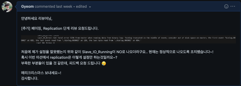 안녕하세요 리뷰어님, [추가] 페이징, Replication 단계 리뷰 요청드립니다. 처음에 제가 설정을 잘못했는지 위와 같이 Slave_IO_Running이 NO로 나오더라구요.. 현재는 정상적으로 나오도록 조치했습니
