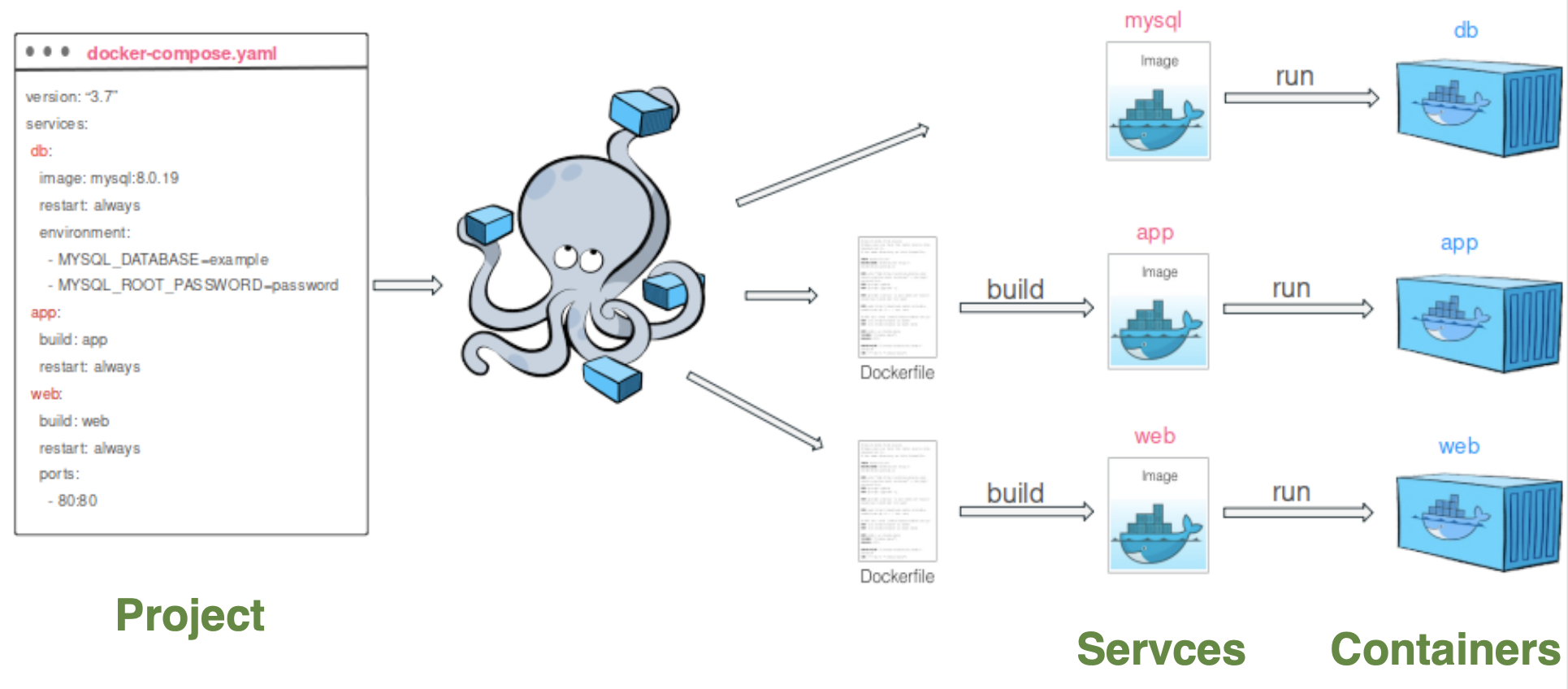 도커 컴포즈 (Docker Compose) 단일 서버에서 여러 컨테이너를 프로젝트 단위로 묶어서 관리 docker-compose.yml YAML 파일을 통해 명시적 관리 프로젝트 단위로 도커 네트워크와 볼륨 관리 프로젝트 내 서비스 간 의존성 정의 가능 프로젝트 내 서비스 디스커버리 자동화 손 쉬운 컨테이너 수평 확장 프로젝트 (Project) 도커 컴포즈에서 다루는 워크스페이스 단위. 함께 관리하는 서비스 컨테이너의 묶음. 프로젝트 단위로 기본 도커 네트워크가 생성 됨. 서비스 (Service) 도커 컴포즈에서 컨테이너를 관리하기 위한 단위. scale을 통해 서비스 컨테이너의 수 확장 가능. 컨테이너 (Container) 서비스를 통해 컨테이너 관리. 컨테이너 (Container) 서비스를 통해 컨테..