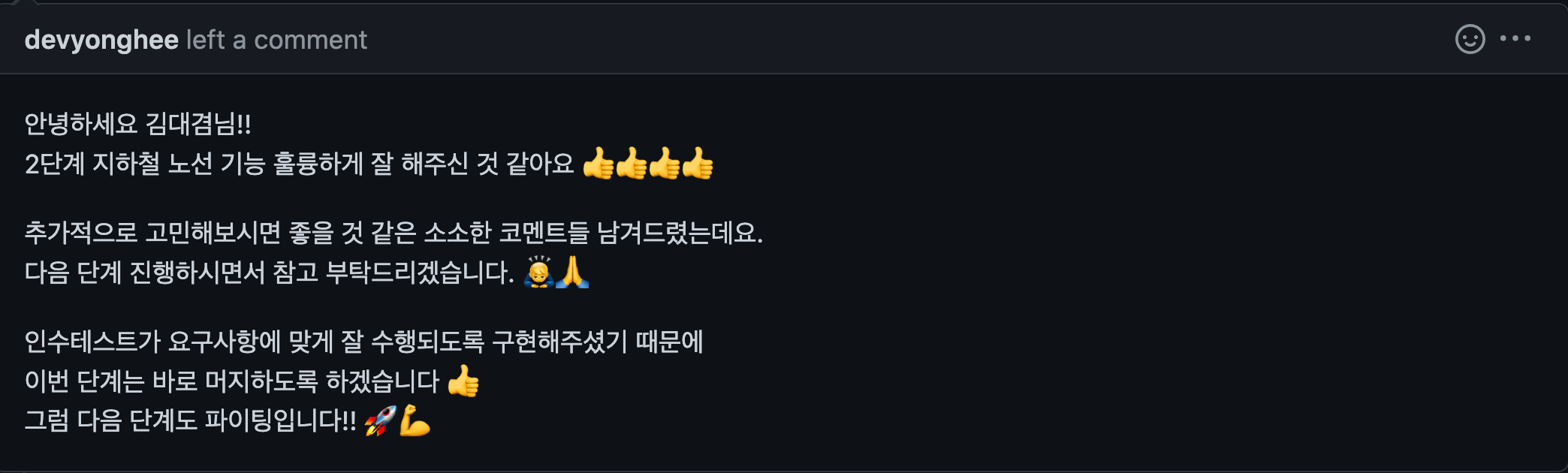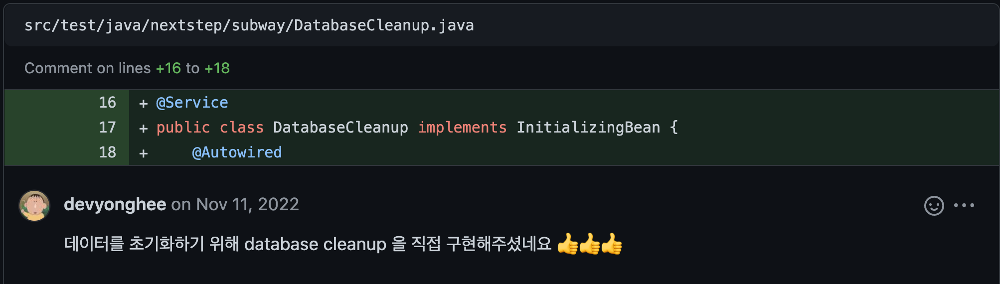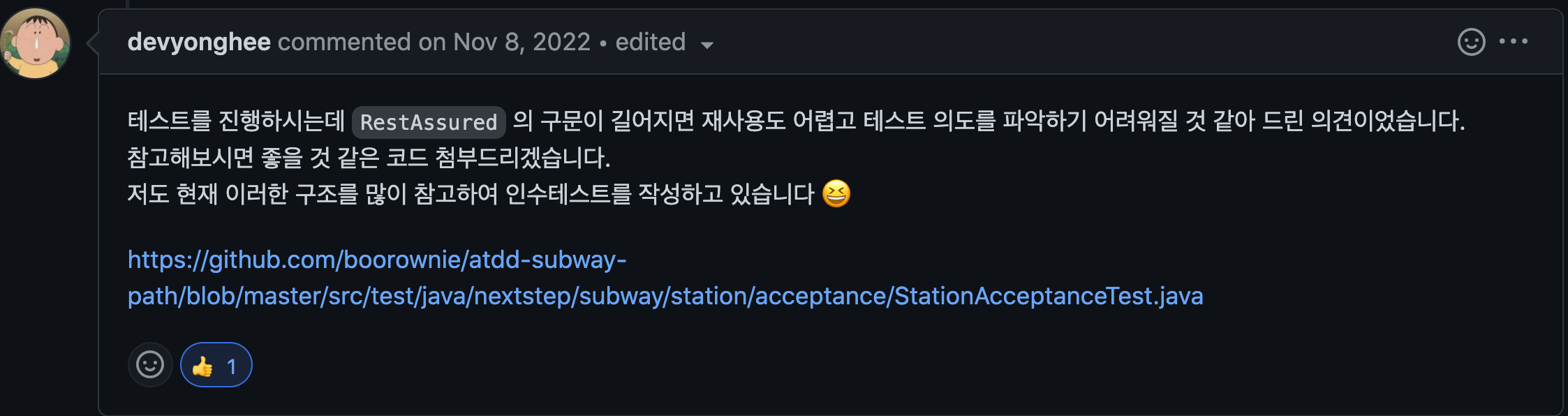 - 리뷰어님께서 인수테스트의 동작들을 분리해보는 것을 제안해주셨고 샘플 예제까지 링크를 공유해주셨다.