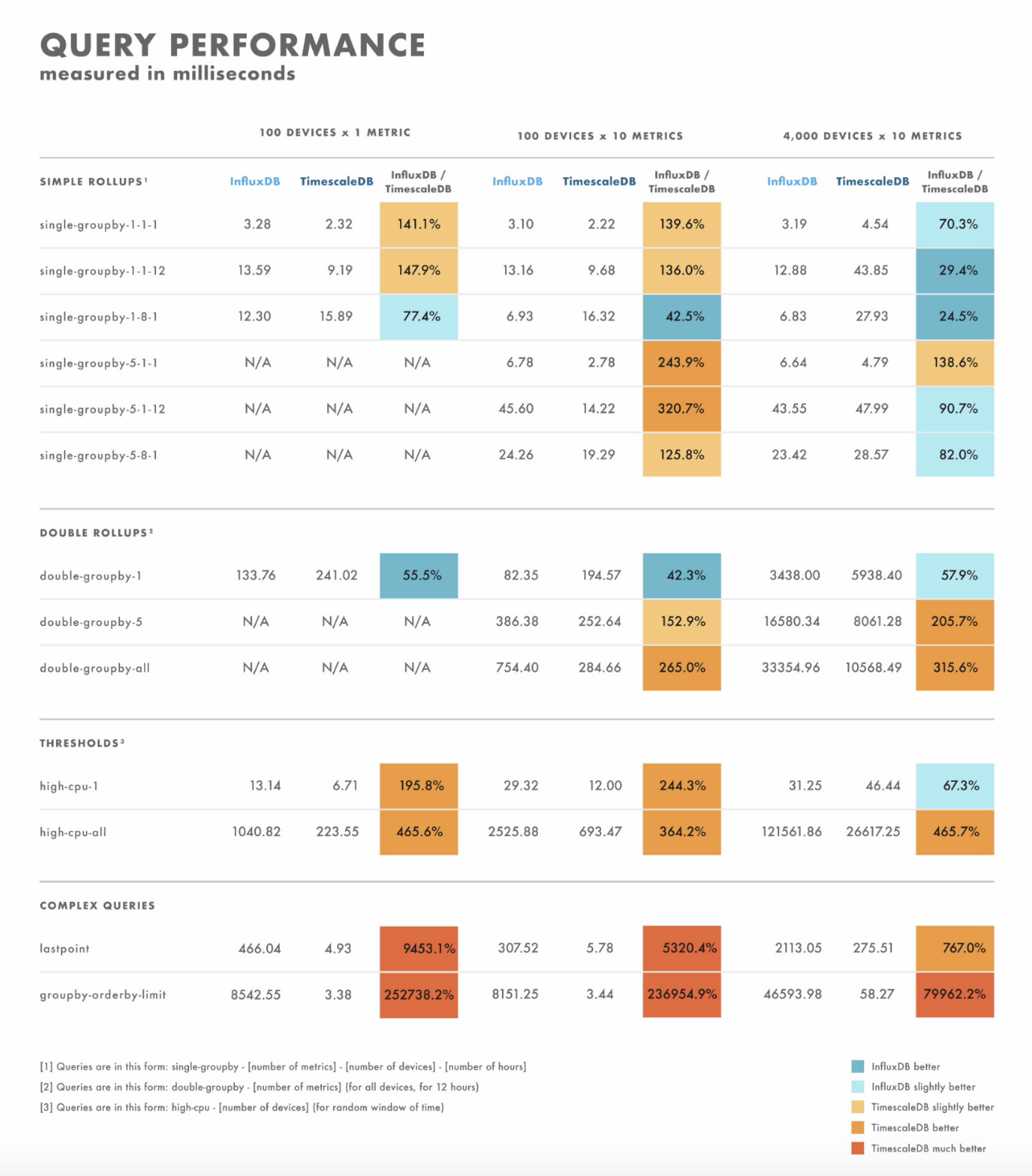 - 복잡한 쿼리의 경우 TimescaleDB는 InfluxDB보다 훨씬 뛰어난 성능을 보이며, 더 다양한 쿼리 유형을 지원합니다. (여기서의 차이는 종종 몇 초에서 수십 초 범위에 있습니다.)